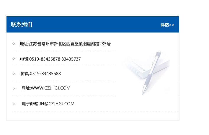 地址:常州市新北區友邦商務大廈1幢16、17層  電話:0519-85101652  傳真:0519-85112595  郵編:213022  網址:www_cz-jiayue_cn.js-xxl.com  郵箱:xiajifengaa@163.com